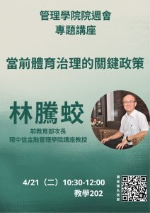 為增進師生對國家體育政策發展與治理實務的了解,特別於本次院週會邀請到前教育部次長、現任中信金融管理學院林騰蛟講座教授蒞臨演講,講題為「當前體育治理的關鍵政策」,報名至4月20日下午4時。
